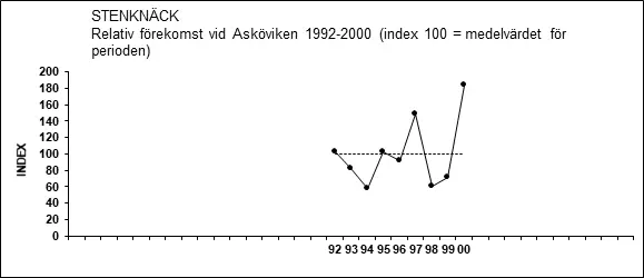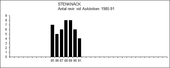 1953/54 ”Fågeln är redan känd som övervintrare-kringstrykare men förtjänar ändå att omnämnas. Nyårsdagen 1954 iakttogs 1 ex. ad. vid Kvarnberget, N Asköviken… På exakt samma plats uppehöll sig en stenknäck ad. vid två tillfällen i slutet av dec. 1954 (Bo Kumlin m. fl.). Fågeln livnärde sig på alfrö.” (Jens Wahlstedt 1955b). ”Den ovanligt sena hösten var den sannolika orsaken till iakttagelser av stenknäck… …mitt under vintern.” (V.N.F. 1954-04-06, § 1). ”…sågs vid Kvarnberget…” (Bertil Walldén 1955). ”Ett ex. vid Asköviken den 1.1.1954.” (Rolf Kumlin & Bo Kumlin 1955).