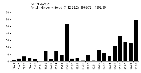 1954/55 ”På exakt samma plats [Kvarntorpet i Västerås-Barkarö] uppehöll sig en stenknäck ad. vid två tillfällen i slutet av dec. 1954 (Bo Kumlin m. fl.). Fågeln livnärde sig på alfrö.” (Jens Wahlstedt 1955b). ”1 ex., Askö, den 21.12. och 28.12. 1954…” (Rolf Kumlin & Bo Kumlin 1956).