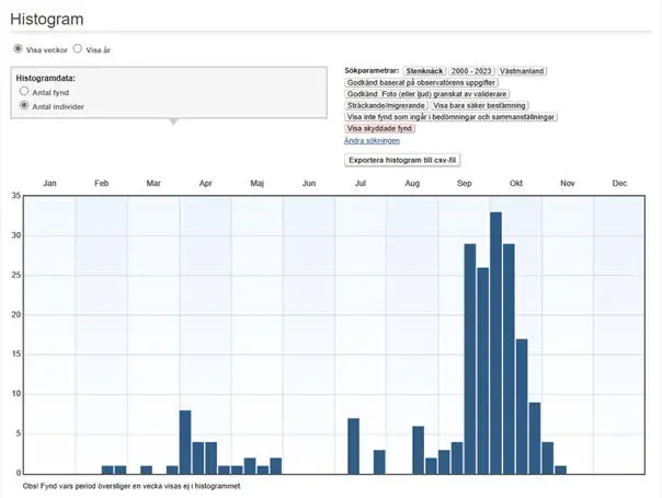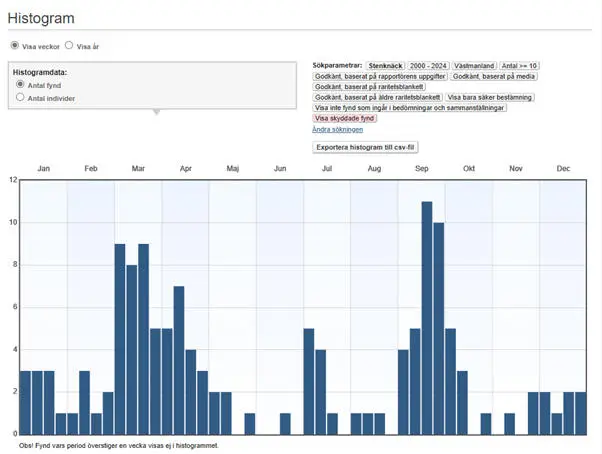 Större (minst 10 ex.) ansamlingar kan uppträda under större delen av året, men med klart högre frekvens i mars, april och september. De största (minst 25 ex.) ansamlingarna under perioden 2000-2024: