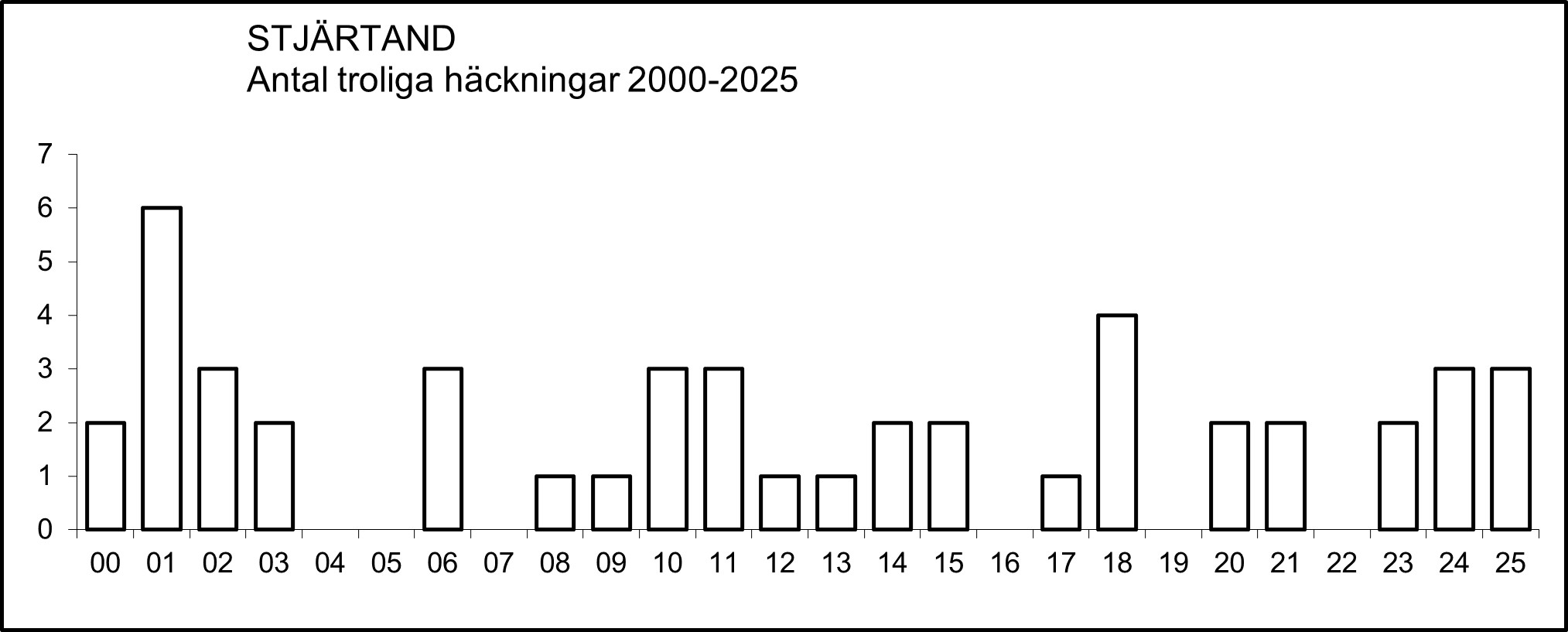 2020 1 2K ♂ Trångfors i Svedvi 17.2-2.3 och troligen samma individ Skanssjön i Svedvi 10.3 (FiV 52[2-3]:36).