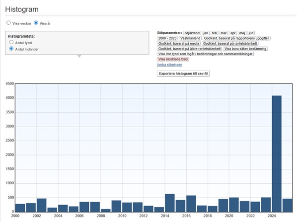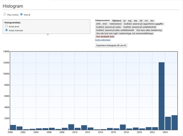 2025 1 ♂ r. Fåsjön i Nora 13.11 (Västmanlands rapportkommitté).