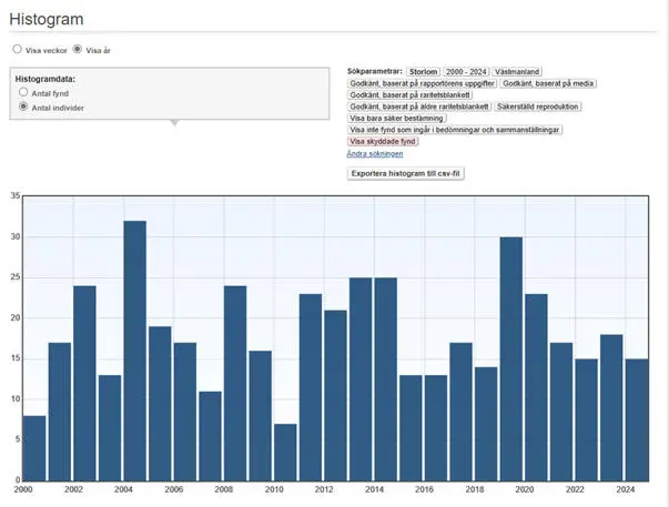 Under perioden 2000-2024 är sju (7) vinterfynd rapporterade: