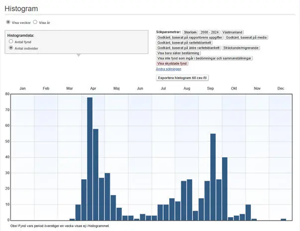 Sommartid kan större ansamlingar ses. De största (minst 30 ex.) rapporterade ansamlingarna 2000-2024: