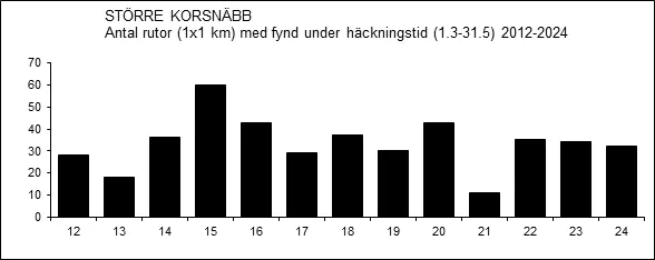 Större korsnäbben är nomadisk i sitt leverne och vissa år kan den uppträda betydligt rikligare än andra år. Särskilt 2002 var ett gott år och relativt höga sträcksummor kunde inräknas.
