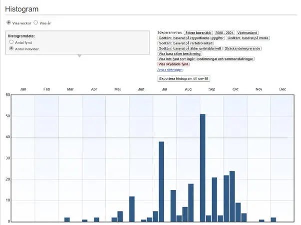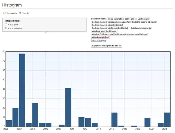 De högsta (minst 10 ex.) sträcksummorna under perioden 2000-2023, samtliga rapporterade som gällande större korsnäbb: