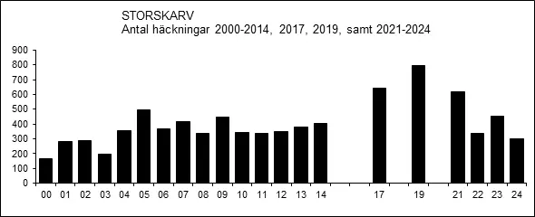 Storskarven förekommer häckande sedan 1994 på flera lokaler i Mälaren. Expansionen tycktes ha kulminerat år 2005 då fem kolonier med sammanlagt 494 bon fanns i västmanlandsdelen av Mälaren (FiV 37:105), varefter antalet häckande par har gått ned något. Efter ett par års uppehåll inventerades storskarven åter 2017, då hela 640 par fanns på fyra lokaler i Mälaren (FiV 49[2-3]:35). En förnyad inventering 2019 gav vid handen att antalet häckande par hade ökat ytterligare till 794 på fyra lokaler (FiV 51[2-3]:31). Nästa inventering genomfördes 2021 och då noterades sammanlagt 618 par på sex lokaler (FiV 54[2-3]:51). År 2022 fanns sammanlagt 337 par på sex lokaler och år 2023 summerades sammanlagt 451 par på fem lokaler (Per Hedenbo, in litt.), men året därpå, 2024, endast sammanlagt 300 bon i tre kolonier (Västmanlands rapportkommitté).