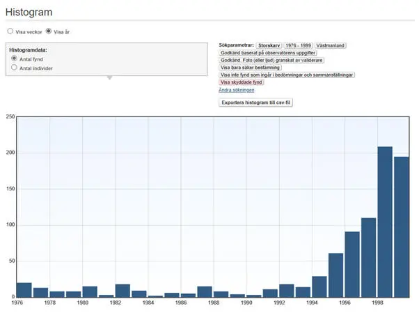 Inga större (minst 200 ex.) ansamlingar rapporterades före år 2000.