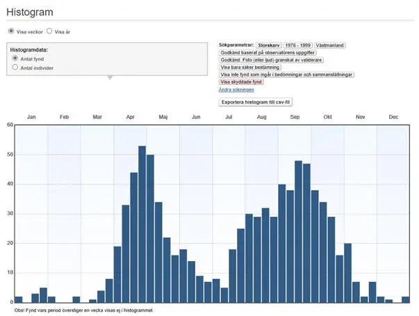 2017 Asköviken i Västerås-Barkarö 20-21.9, som mest 215 r. 21.9 (FiV 49[2-3]:35).