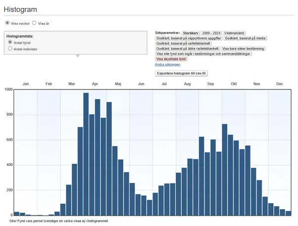 Storskarven har observerats under årets samtliga månader, men ses mest frekvent från islossning till isläggning. Före storskarvens etablering 1994 som häckande i landskapet, var fynden i hög grad koncentrerade till september och oktober. Därefter har framför allt vårfynden ökat markant liksom, förstås, sommarfynden.