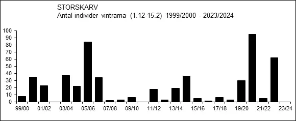 Vinterfynd (december-februari) har gjorts allt oftare, framför allt sedan mitten av 1990-talet och vissa milda höstar kan åtskilliga skarvar dröja sig kvar in i december. Tidiga vårar, som 1998, 2008, 2015 och 2016, har de tidigaste fynden gjorts redan i februari. Merparten av vinterfynden är geografiskt koncentrerade till Mälaren, men en hel del vinterfynd har också gjorts i övriga delar av landskapet.