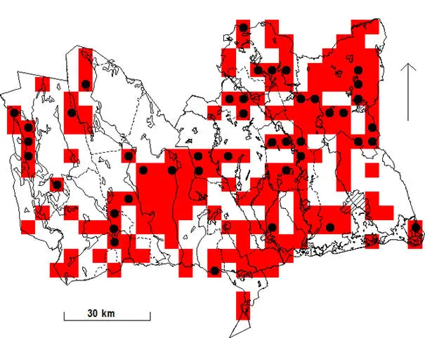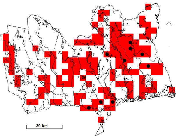 Rutor (5×5 km) med fynd under häckningstid 1974-1984. Svart prick anger ruta med säkerställd häckning.