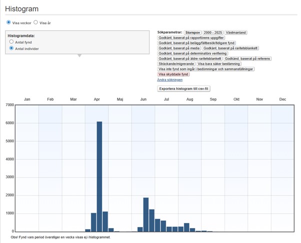 Veckovis fördelning av sträckande storspovar 2000-2025.