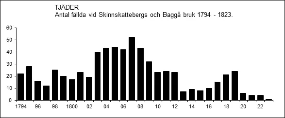 En god förekomst av tjäder i slutet av 1700-talet och början av 1800-talet indikeras av en jaktjournal, förd av brukspatron Wilhelm Hisinger vid Skinnskattebergs och Baggå bruk i Skinnskatteberg åren 1794-1823. Där nedlades tjädrar samtliga år under perioden, som mest 52 ex. år 1807 (Anonym 1908). Se histogram nedan.