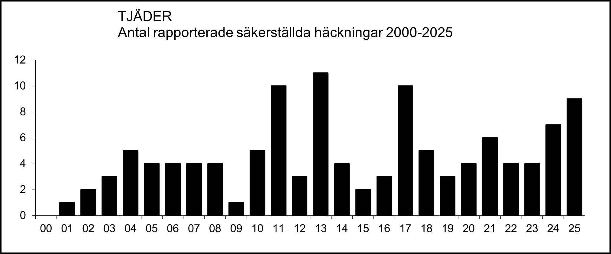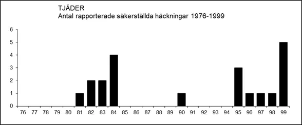 | 1946 | Västmanlands län | ”Tjädern är fortfarande påfallande svag i sin förekomst [jaktåret 1946-47].” (Anonym 1947). |
