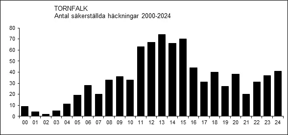 En del av ökningen under det första decenniet efter millennieskiftet kan nog tillskrivas de många uppsatta holkarna i delar av landskapet. År 2006 fanns 120 holkar uppsatta i södra Västmanland, och i dessa fanns detta år 16 häckningar (Laila Andersson 2007). År 2010 var ett särskilt gott år för tornfalk med 50 kullar (Ulf Eriksson 2011). Merparten av dessa häckningar har dock inte rapporterats till Artportalen, varför de saknas i figuren nedan.