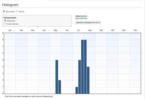Mediandatum för första och sista fynd under perioden 1976-1999 är den 13 maj respektive 9 september.