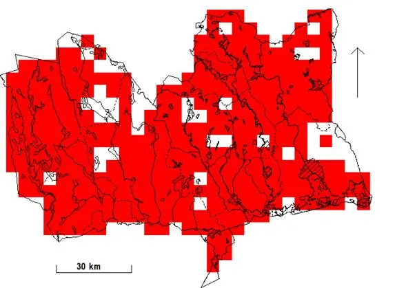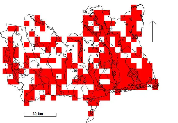 Rutor (5×5 km) med fynd under häckningstid 1974-1984.