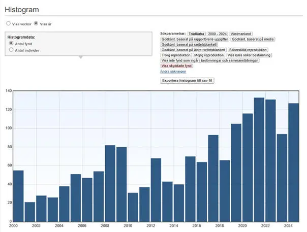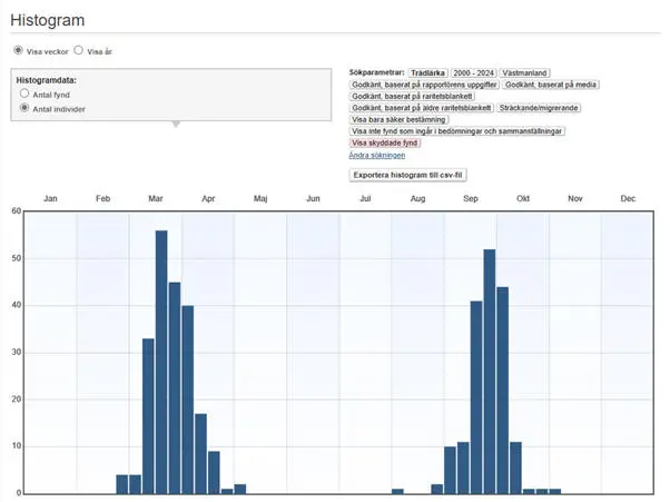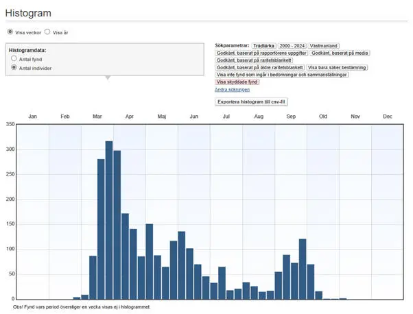 Trädlärkan flyttar vanligen ensam eller några få tillsammans, men ibland ses större ansamlingar rasta och sträcksummor noteras. De allra högsta (minst 10 ex.) under perioden 2000-2024: