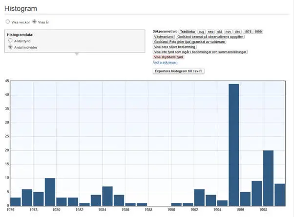 Större (minst 10 ex.) ansamlingar under perioden 1976-1999: