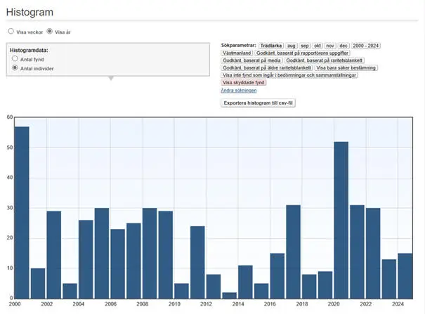 De på året tidigaste kända fynden före 1976, gjordes den 8 mars 1971 vid Asköviken i Västerås-Barkarö (Mats Logander, opubl.) respektive den 12 mars 1973 vid Hallaren i Möklinta/Sala (Sören Larsson, opubl.). Den största kända ansamlingen före 1976, utgjordes av 15 ex. vid Eriksbo i Västerås-Barkarö den 30 mars 1959 (Hans-Olof Hellkvist, opubl.). En hög sträcksiffra var 32 sträckande vid Asköviken i Västerås-Barkarö den 28 mars 1957 (Bo Kumlin, opubl.).