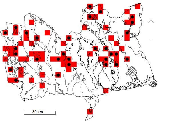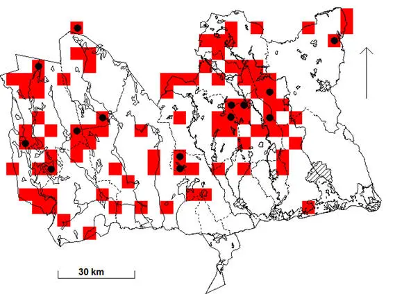 1950-51 ”…hör hemma i barr- och blandskog från Värmland, Västmanland och norra Uppland till norra Lappland…” (Gunnar Svärdson & Sigfrid Durango 1950-51, s. 331).