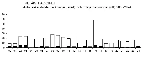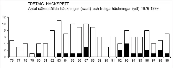 Under perioden 1951-1975 rapporterades tretåig hackspett från sammanlagt 18 lokaler under häckningstid, i fyra fall med säkerställd häckning. Dessa fördelade sig sockenvis på Möklinta, Sala, Fläckebo och Sura.