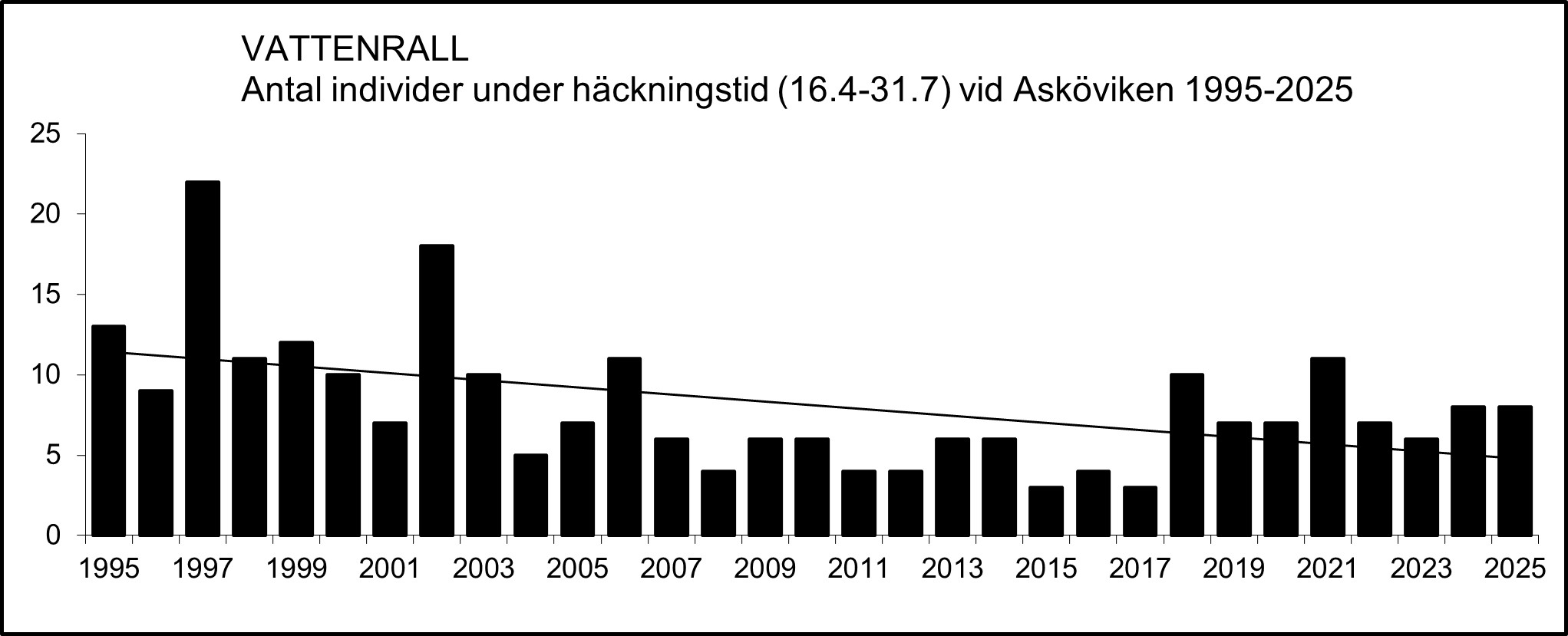Vid Asköviken i Västerås-Barkarö var minskningen av antalet individer under häckningstid under perioden 1995-2017 statistiskt säkerställd (P<0,02; n=23; rs=˗0,735).