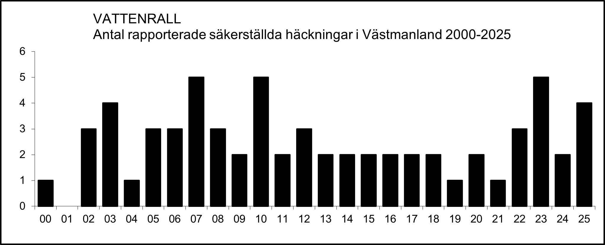 Under perioden 2015-2025 har vattenrall påträffats under häckningstid (16.4-31.7) i sammanlagt 102 så kallade atlasrutor (5×5 km). I flera rutor, i synnerhet i Mälarområdet, förekommer flera par per ruta. Vid en gissning att 50 av dessa rutor hyser i genomsnitt 5 par per ruta och övriga ett (1) par per ruta, ger detta cirka 300 par i Västmanland, en siffra som också Ulf Ottosson m.fl. (2025) kom fram till.