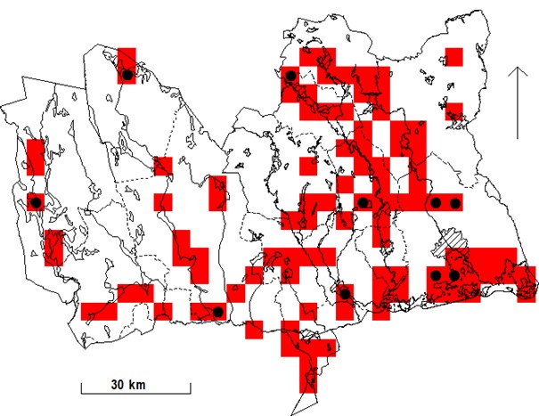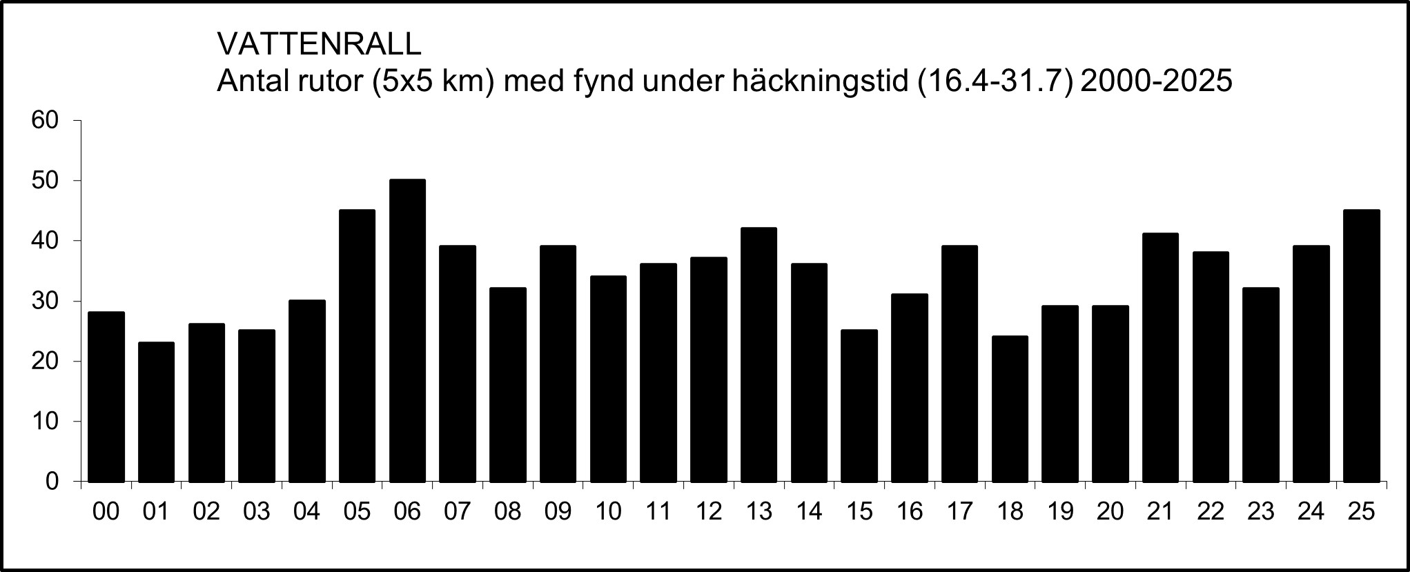 Om man mäter förekomsten över tid som antal rutor (5×5 km) med fynd under häckningstid (16.4-31.7) synes inga större förändringar under perioden 2000-2025.
