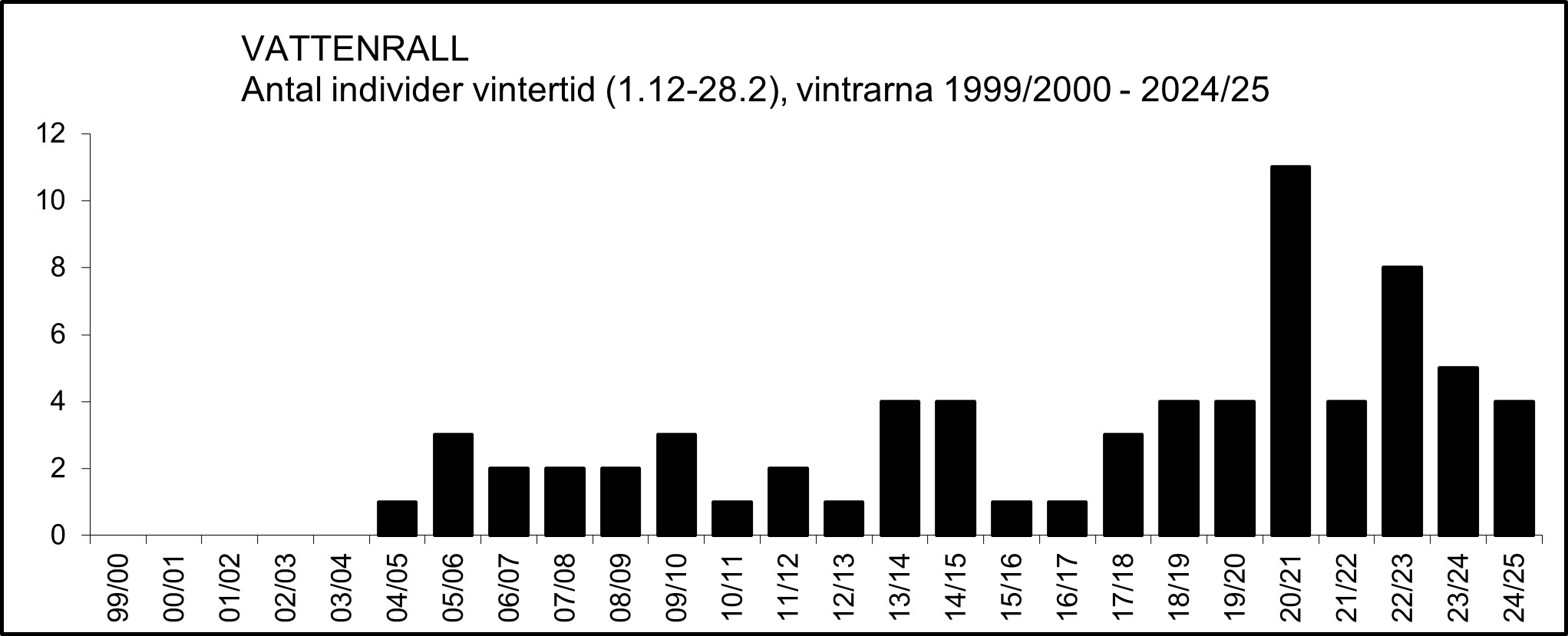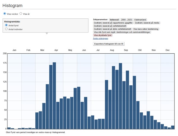 På våren brukar de första vattenrallarna siktas i slutet av mars eller början av april. Mediandatum för första observation vårarna 2000-2025 är den 26 mars. Mediandatum för sista observation under perioden 2000-2025 är den 31 oktober. I tabellen nedan ingår inte vinterfynd (1.12-28.2).