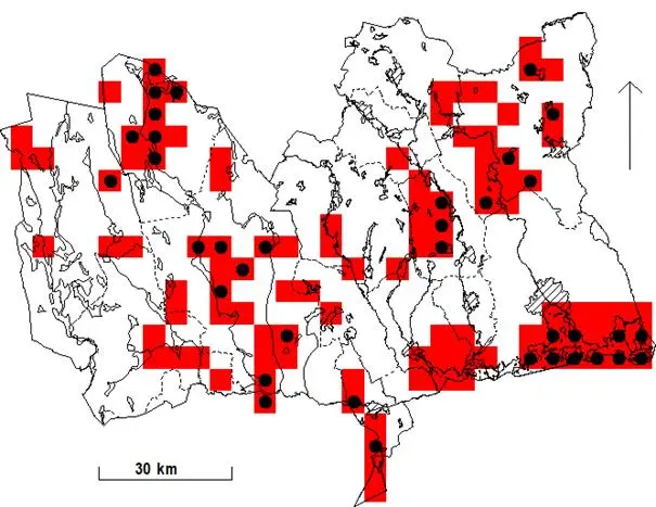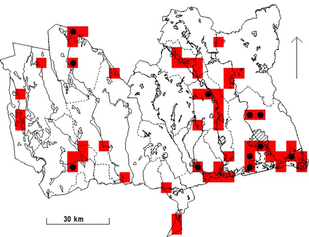 Rutor (5×5 km) med fynd under häckningstid 1974-1984. Svart prick anger ruta med säkerställd häckning.