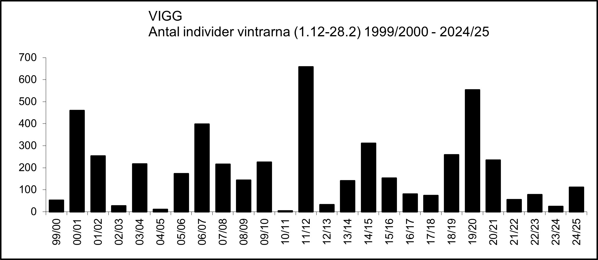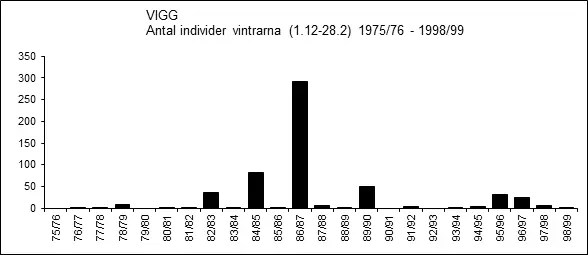 Det var relativt glest med vinterfynd (1.12-28.2) under perioden 1976-1999, vilket framgår av figuren nedan och i jämförelse med motsvarande figur för perioden 2000-2025, se nedan.