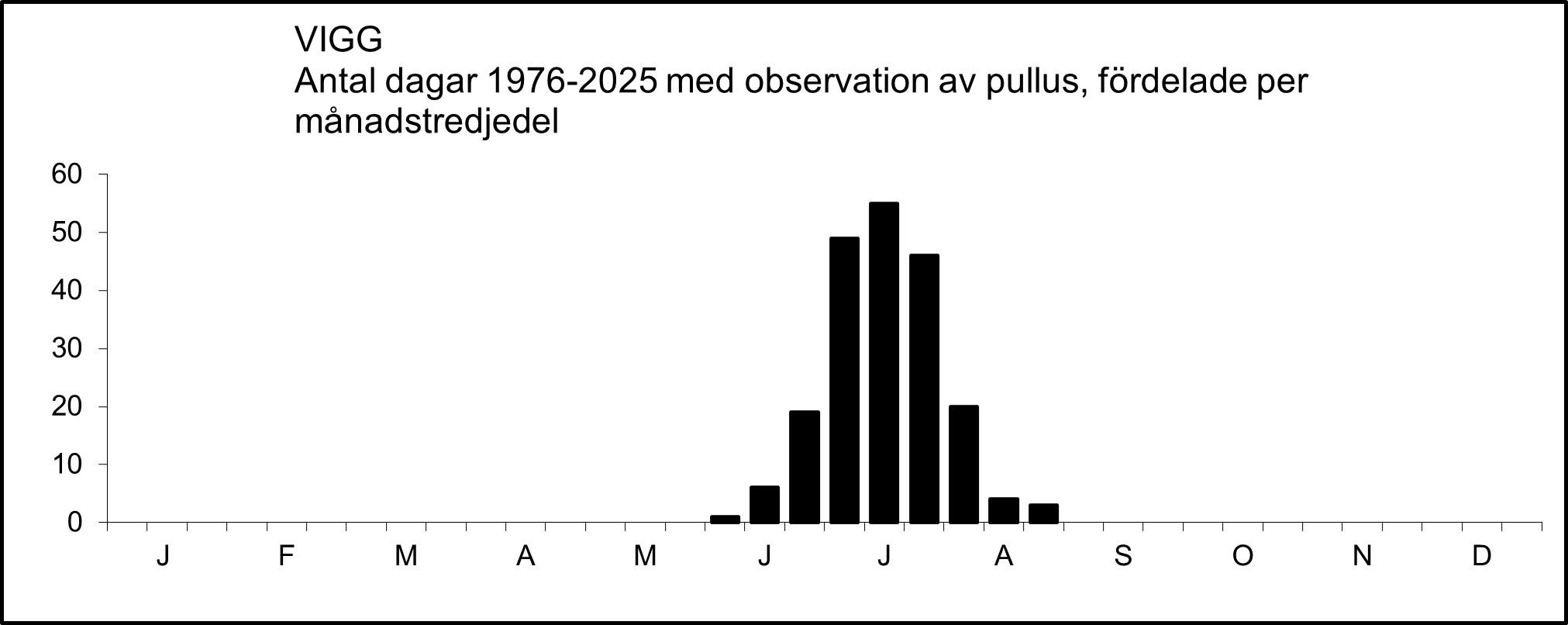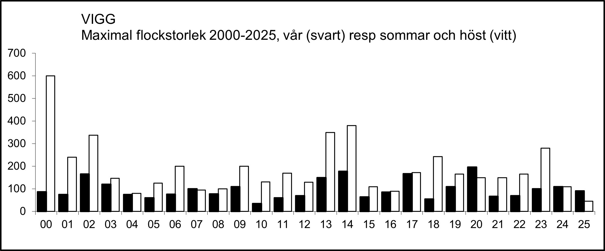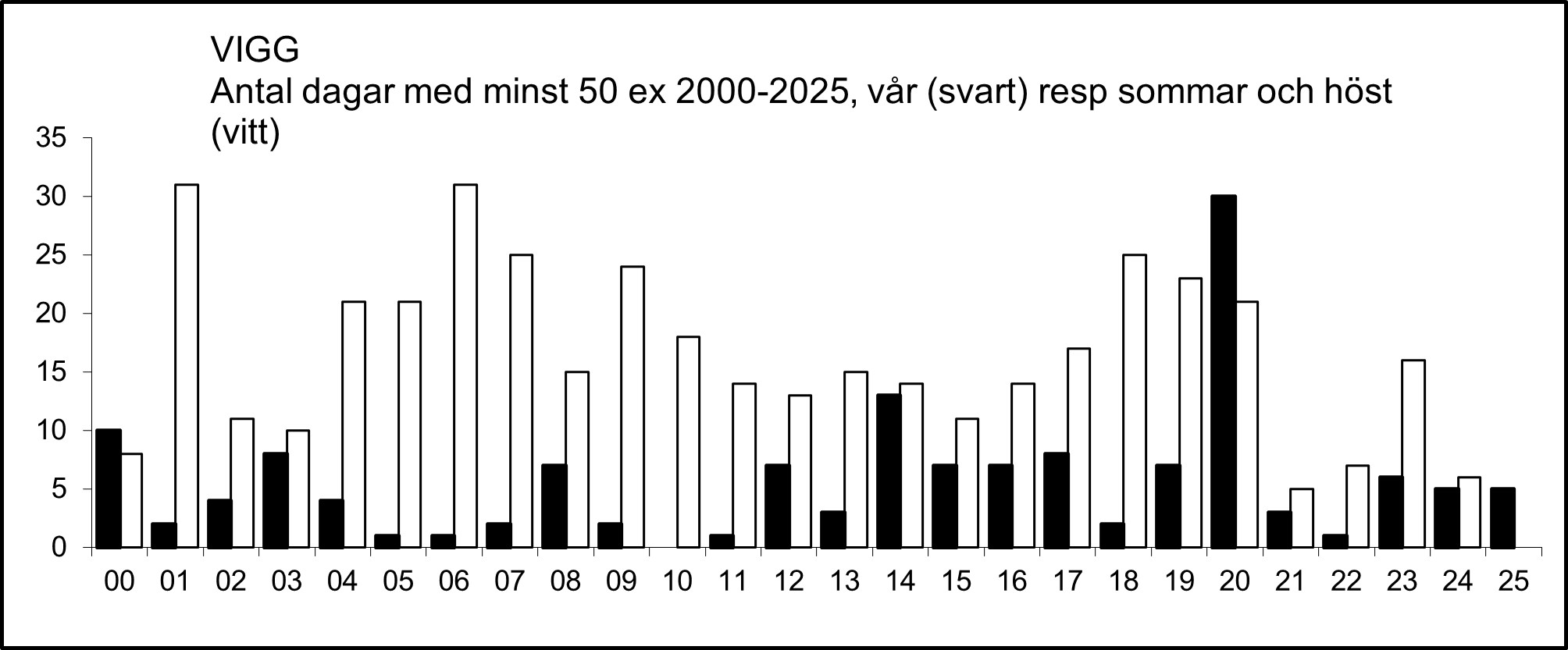 Aktivt sträckande viggar ses ganska sällan, men i figuren nedan syns två rätt markanta toppar, en i juli och en i början av oktober. De högsta (minst 50 ex.) dagssummorna av sträckande viggar 2000-2025: