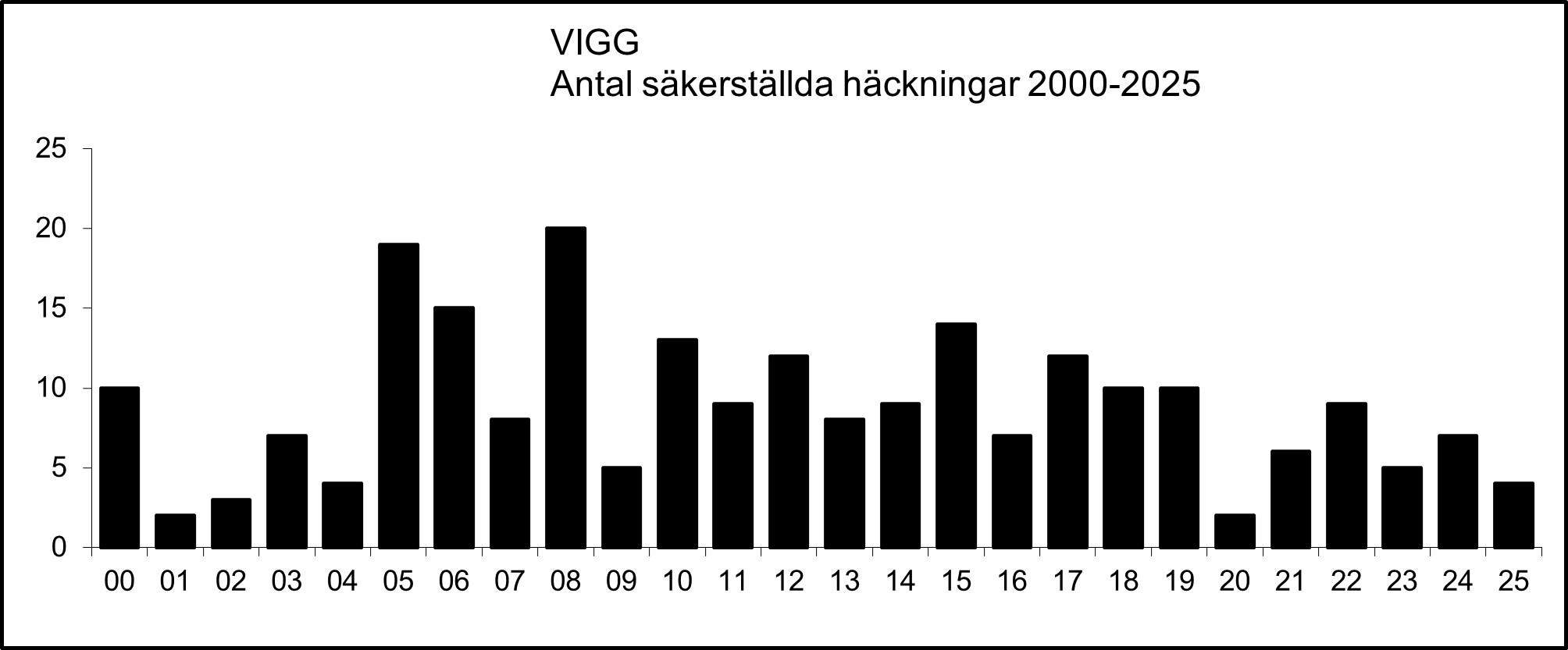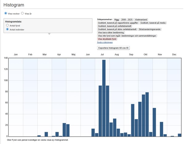 Veckovis fördelning av viggar som har rapporterats som sträckande 2000-2025.