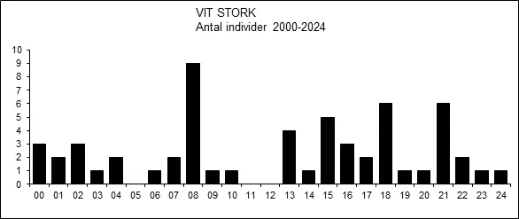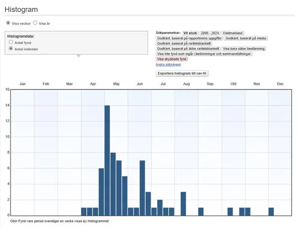 Veckovis fördelning av vita storkar 2000-2024.
