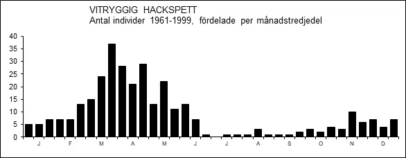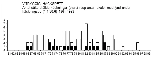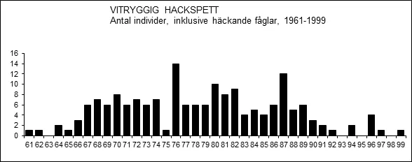 1964-65 ”Vid vår klubblokal ’Kråkslottet’ [vid Semla i Västanfors] uppehöll sig en hane av vitryggig hackspett från nov. 1964 till slutet av mars 1965. Omkring den 15 nov. i år dök åter en vitryggig hackspett upp. Får se hur länge detta ex. stannar?” (Per Leif Lejdelin 1965).